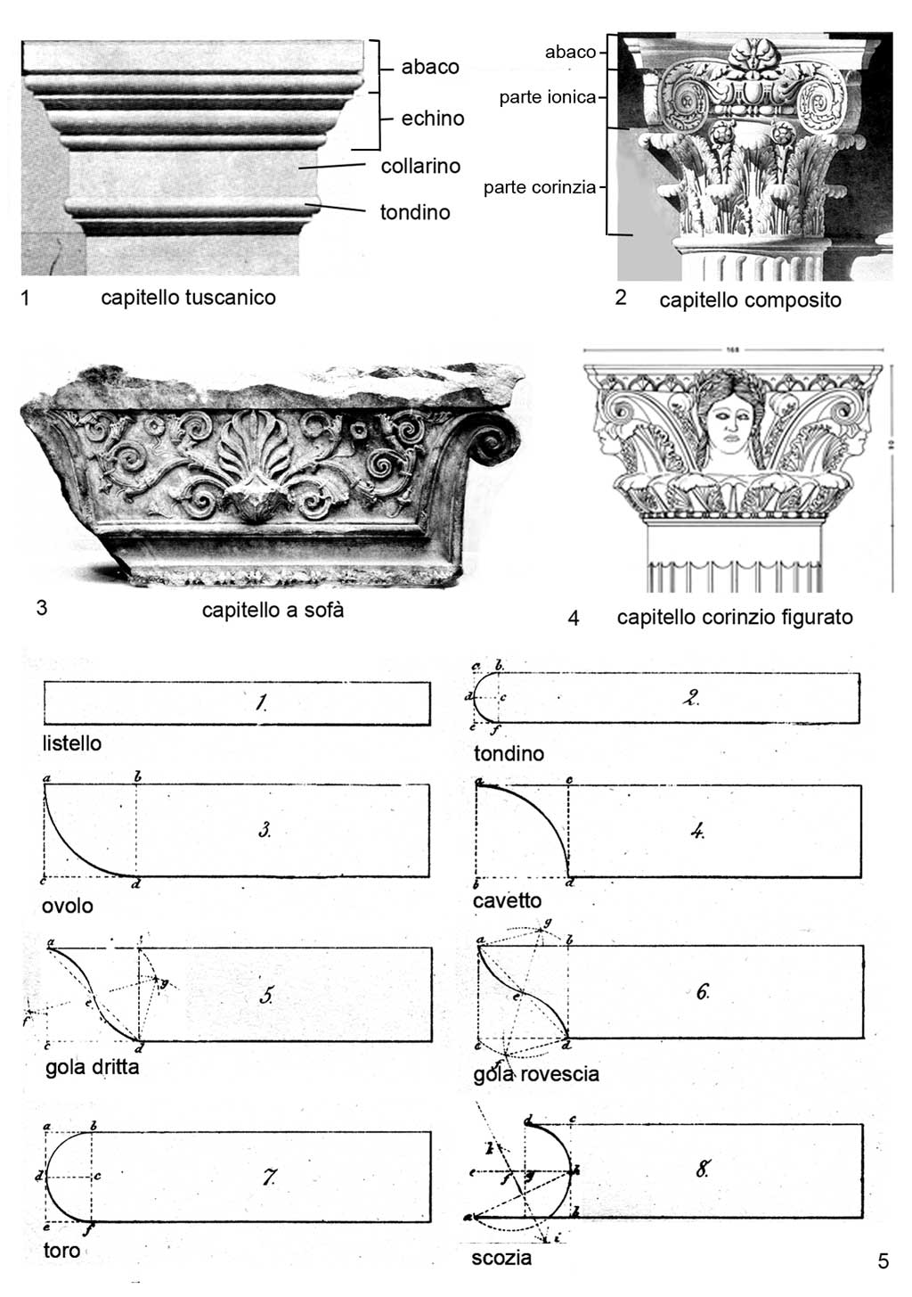 Fig. 127. Tipi di capitelli. Modanature: 1. Capitello tuscanico di lesena del Grande Emiciclo dei Mercati Traianei (rilievo di P.M. Morey, 1836, in Roma Antiqua, ibid.). 2. Capitello composito dell’arco di Tito (rilievo di A.J.M. Guénepin, 1810, in Roma Antiqua, ibid.). 3. Capitello a sofà dal Didymèion di Mileto (Parigi, Museo del Louvre). 4. Capitello corinzio figurato da Canosa di Puglia (in P. Pensabene, Il tempio italico sotto San Leucio, in R. Cassano (a cura di), Principi Imperatori Vescovi. Duemila anni di storia a Canosa, Venezia 1992). 5. Tipi di modanature (da VIGNOLA, ibid., tav. IV).