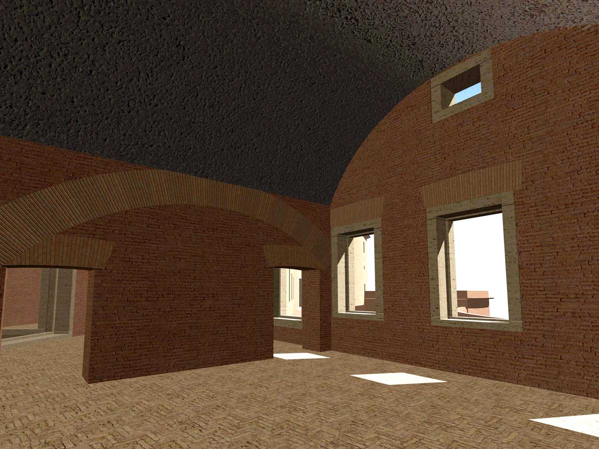 Figura 19 - L'ambiente principale del  "piano nobile" (III livello) del Corpo Centrale. La sala affacciava sul tratto centrale della via Biberatica, illuminata da tre ampie finestre rettangolari sormontate da una finestrella iscritta nella lunetta della volta. La parete del lato opposto presenta al centro un'abside che inquadrava assai probabilmente la postazione del  funzionario più importante del grande complessivo amministrativo, erroneamente identificato negli anni trenta del secolo scorso con un mercato. Cfr. sull'argomento M. Bianchini, Mercati Traianei. La destinazione d’uso, in BdArch, 16-18, 1992, pp. 145-163. |