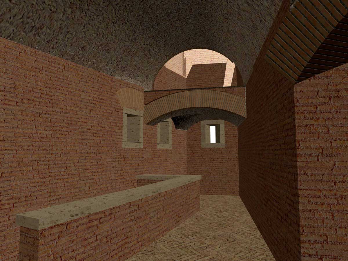 Della copertura crollata restano le impronte sulle pareti interne (a destra). Se ne deduce che nello stretto angolo orientale della stanza (di fronte nell'immagine) era stato ricavato alle spalle del muro perimetrale un piccolo pozzo di luce contro il quale si attestava la lunetta della volta a botte. Sotto il cortiletto era stata realizzata una piccola volta a una quota più bassa di quella principale, la quale dava luogo a una sorta di ripiano situato a un livello intermedio tra il pavimento della stanza e il tetto. La cortina laterizia che si è conservata sulla parete a destra esclude l'esistenza di una scala in muratura che saliva dal pavimento a questo ripiano. E' possibile che si trattasse di un passaggio di servizio, praticabile con scalette provvisorie di legno, che serviva ad accedere al tetto per ispezioni e attività di manutenzione (cfr. M. Bianchini, "La ricostruzione del Corpo Centrale", in L. Ungaro, M.P. Del Moro, M. Vitti (a cura di), I Mercati di Traiano restituiti. Studi e restauri 2005-2007, Roma 2010 pp. 59-76).