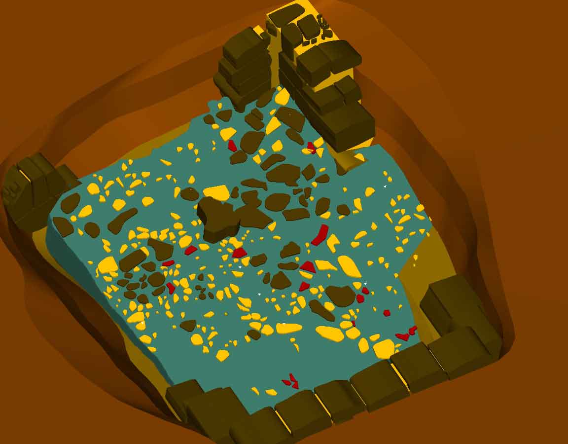 Figura 7 - Rappresentazione 3d dello strato di crollo 552. In marrone i frammenti di tufo di Fidene a scorie nere, in giallo le scaglie di tufo semilitoide locale, in rosso i frammenti di tegole. Il colore verde distingue l'unità stratigrafica in oggetto rispetto alle altre.