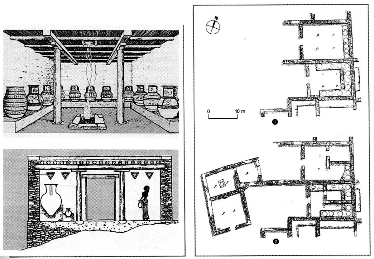 Fig. 7 — Zagora di Andros. A sinistra: ricostruzione dell'ambiente principale di una abitazione. A destra:planimetrie di due insiemi di abitazioni (CAMBITOGLOU 1981)