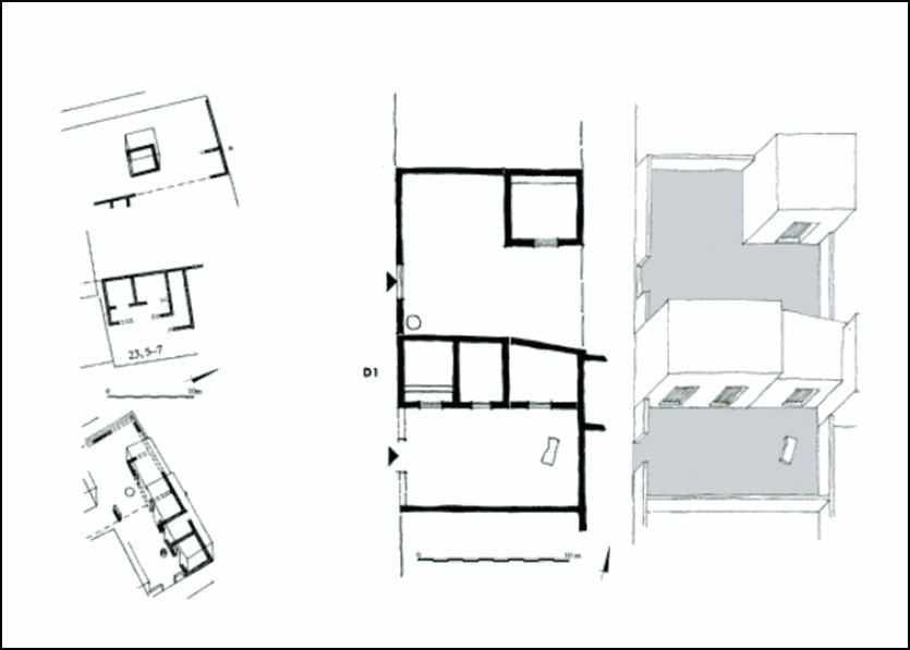 Fig. 11 - Megara Hyblaea Megara Hyblaea. Megara Hyblaea. Esempi di lotti edificati dai coloni. A sinistra: piante di scavo; a destra: planimetria e assonometria ricostruttiva di due lotti adiacenti, comprendenti rispettivamente un abitazione con un solo vano e un abitazione a tre vani (GRAS — TREZINY — BROISE 2004)