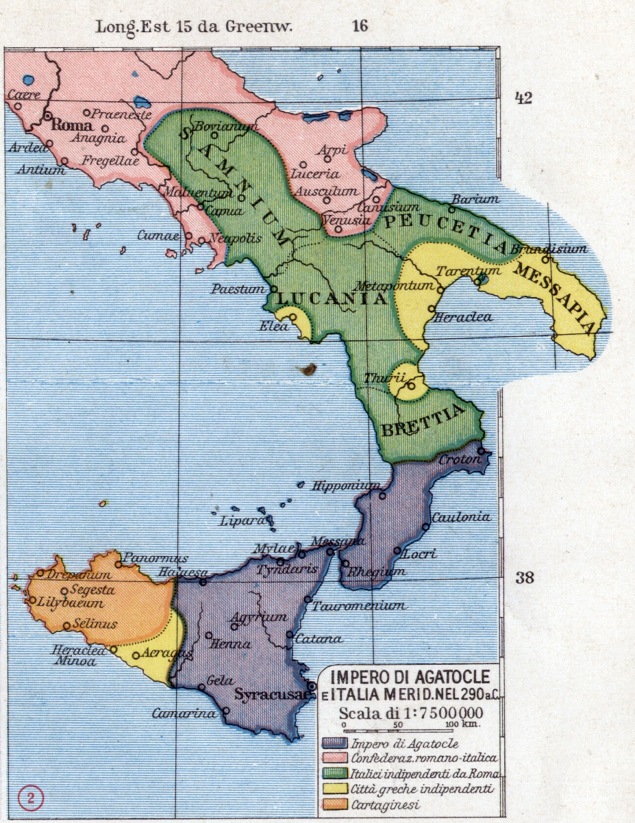 Fig. 1 — Sicilia e Magna Grecia al tempo di Agatocle (ca. 290 a.C.) (DE AGOSTINI 1974)