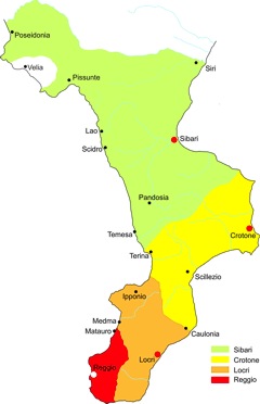 Fig. 2 — Zone di influenza delle principali città greche della Calabria nel VI sec. a.C. (archeocalabria.beniculturali.it)