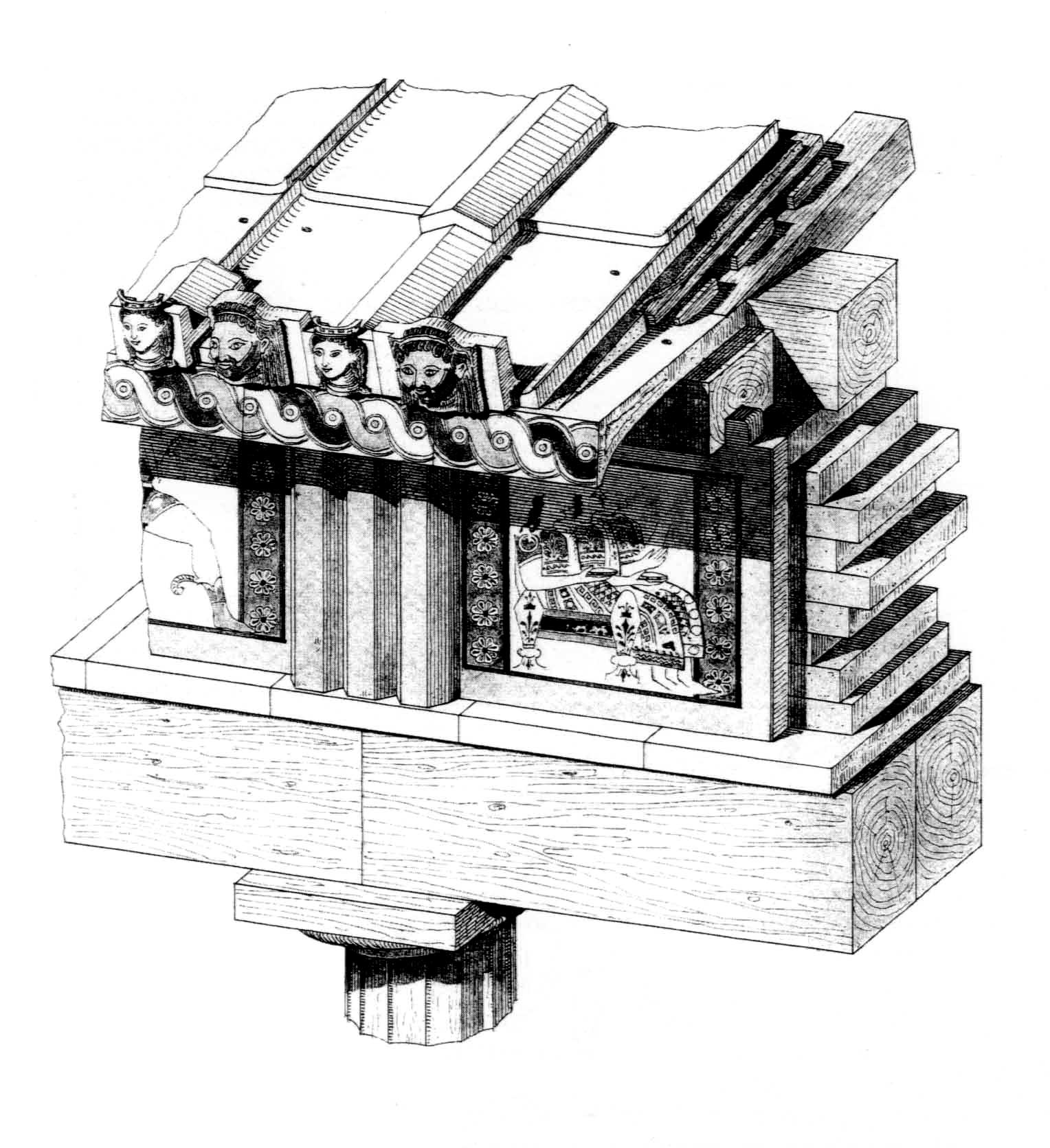 Fig. 3 - Thermo. Tempio di Apollo. Ricostruzione della trabeazione, del tetto e del rivestimento in terracotta (VI sec. a.C.) (SOTIRIADIS — KAWERAU 1908)