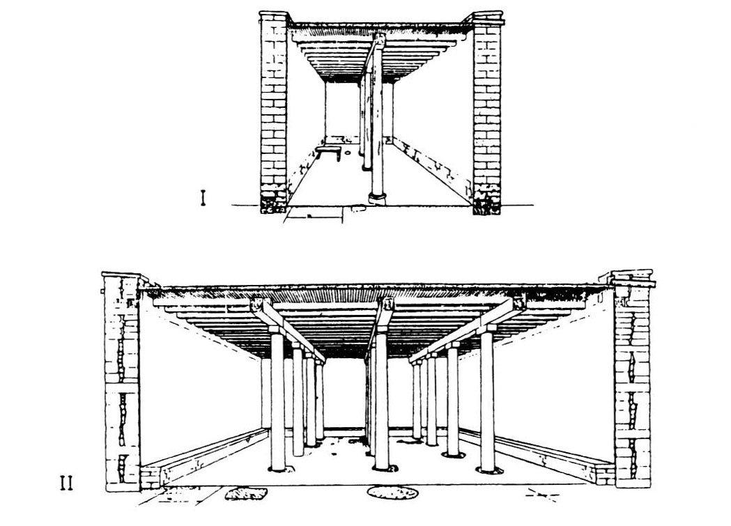 Fig. 10 - Yria di Nasso. Sezione trasversale ricostruttiva delle prime due fasi del tempio di Dioniso (prima metà dell’VIII sec. a.C. e seconda metà dell’VIII sec. a.C.) (GRUBEN 1997)