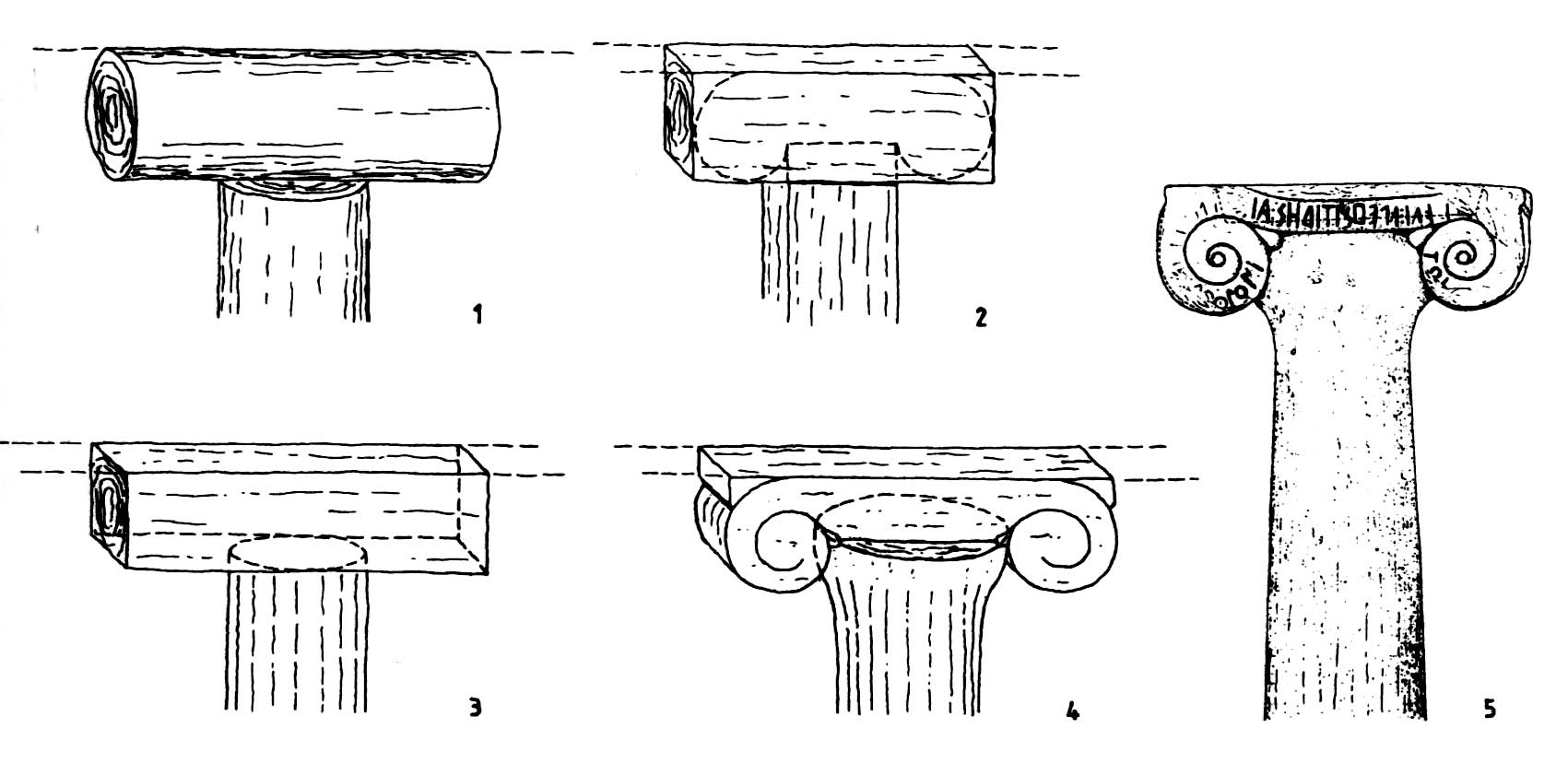 Fig. 13 — Ipotesi sulla formazione del capitello ionico (GRUBEN 1996)