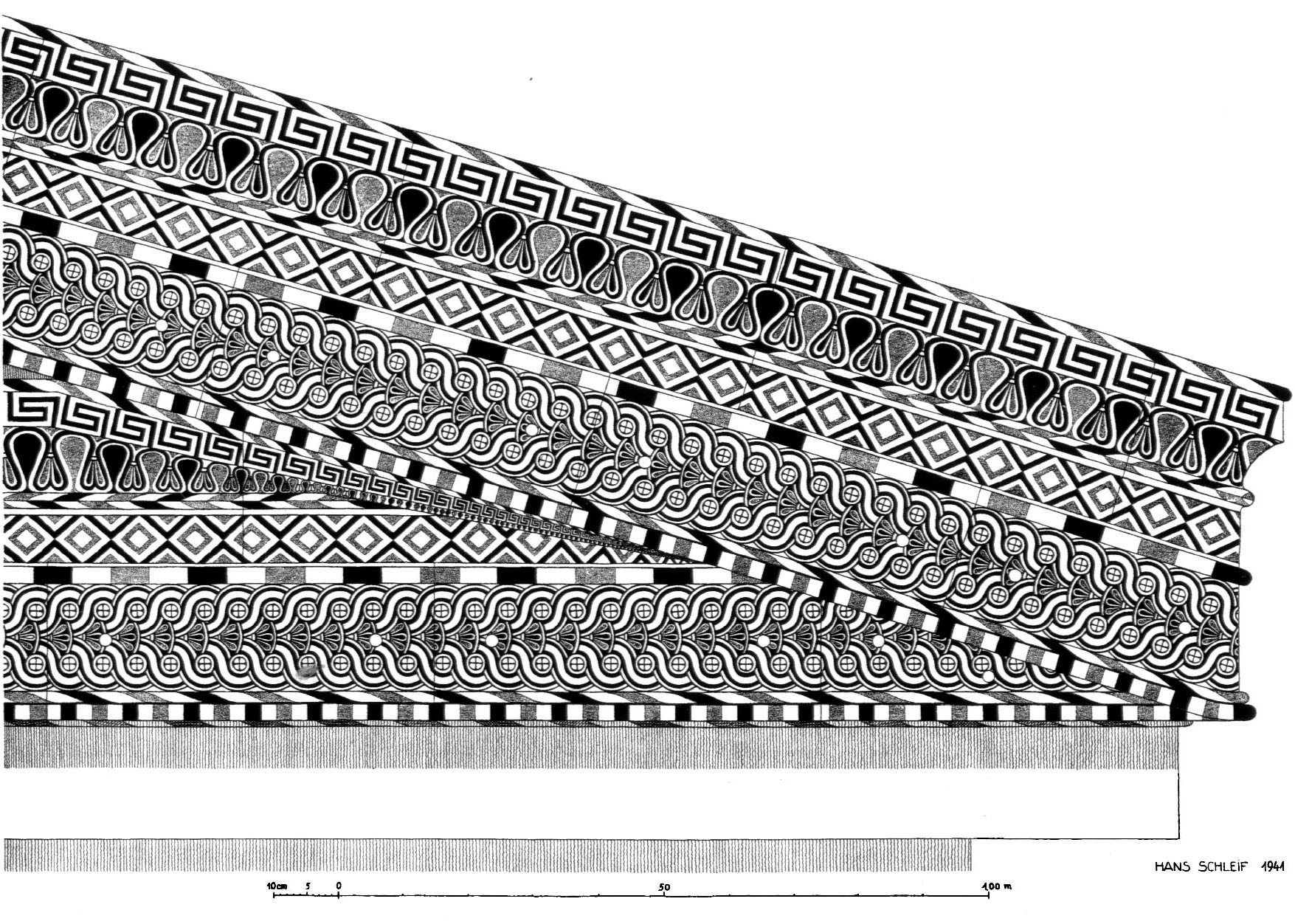 Fig. 6 - Olimpia. Tesoro di Gela. Ricostruzione del rivestimento in terracotta del frontone (KUNZE — SCHLEIF 1944)