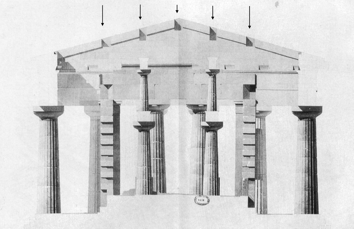 Fig. 9 - Poseidonia. Sezione trasversale del c.d. Tempio di Nettuno. Le frecce indicano gli incassi delle travi portanti del tetto (disegno di Labrouste in HELLMANN 2002 — rielab. dell’autore)