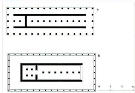 Fig.14 — Planimetria del tempio di Apollo Alaios a Cirò Marina presso Locri (sopra) a confronto con la pianta del tempio di Apollo C a Thermo (sotto) (MERTENS 2006).