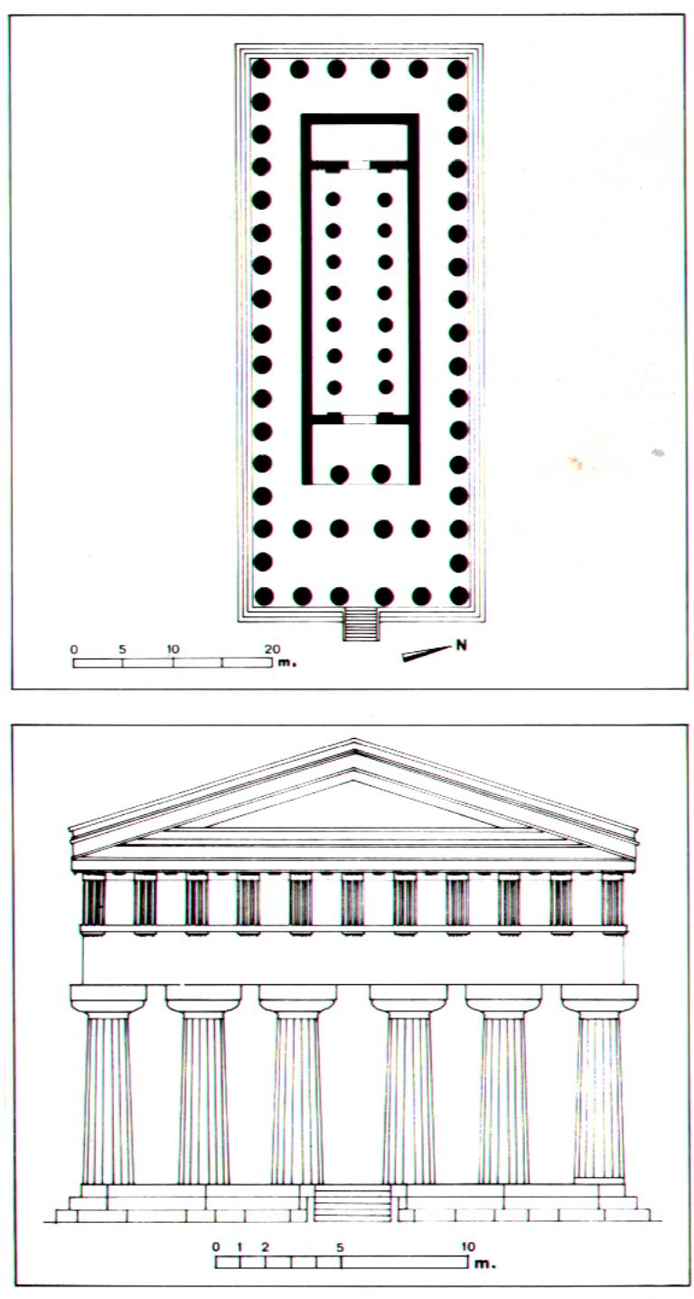 Fig. 17 — Siracusa. Tempio di Apollo. Pianta e prospetto ricostruttivo (BERVÉ — GRUBEN 1961)