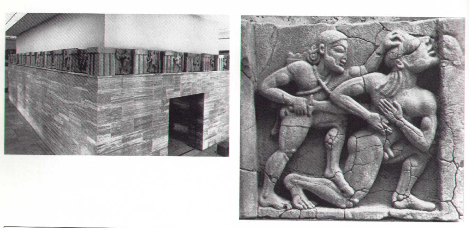 Fig. 19 — Poseidonia. Fregio dell’Heraion del Sele. A sinistra: ricostruzione del c.d. tesoro arcaico con il fregio nel Museo di Paestum; a destra: particolare di una metopa (MARTIN 1980)