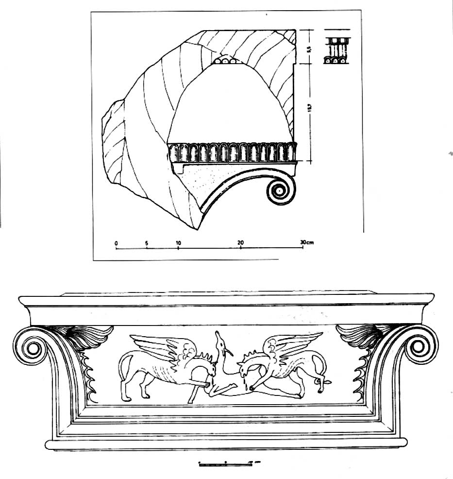 Fig. 1 — In alto: Sibari, frammento di capitello d’anta a sofà di età arcaica (MERTENS 1993); in basso: Samotracia, Propileo di Tolomeo II, capitello d’anta a sofà, restaurato, ca. 285 a.C. (FRAZER 1990)