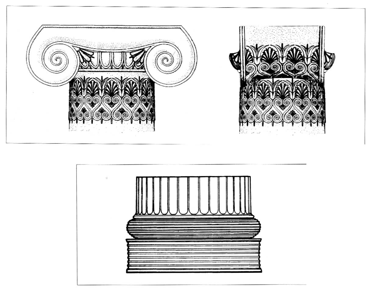 Fig, 3 — Samo. Tempio di Hera IV (tempio di Policrate). In alto: capitello ionico dell’anello esterno della peristasi (GRUBEN 1962). In basso: base della colonna ROCCO 2003)