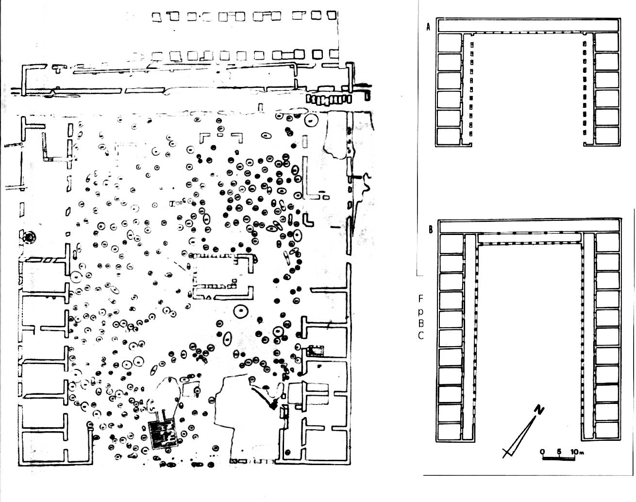 Fig. 4 — Locri. Stoa a U. A sinistra: pianta dei resti attuali (GRECO 1980). A destra: ricostruzione della prima fase, ca. 700 a.C (a sinistra) e della seconda fase, ca. 550 a.C (GULLINI 1990)