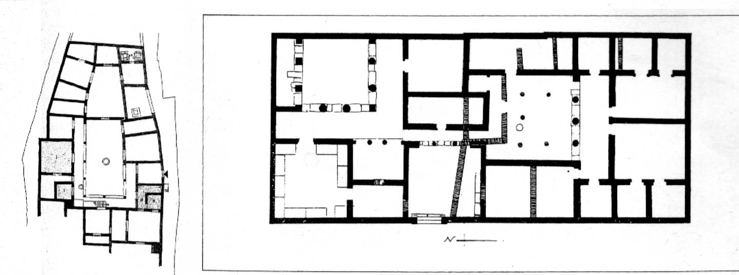 , pianta di casa a peristilio 49, 19 di età ellenistica. A destra: Morgantina, casa ellenistica del Magistrato (BARRA BAGNASCO 1996)
