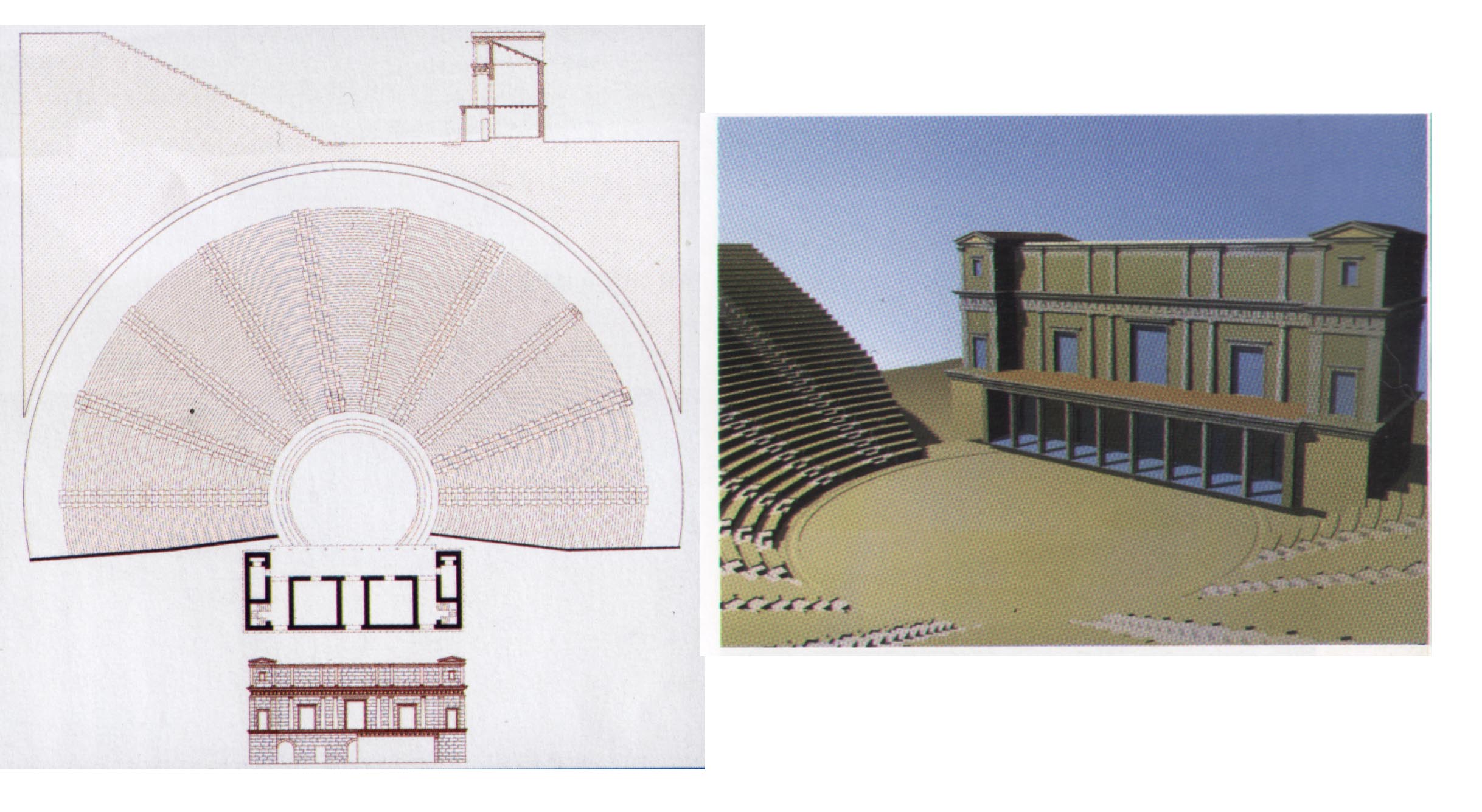 Fig. 14 - Tindari. Impianto greco del teatro. A sinistra: pianta, prospetto e sezione. A destra: ricostruzione 3d (MAZZEO 2001)