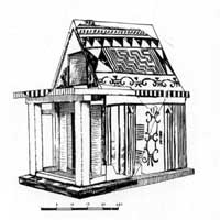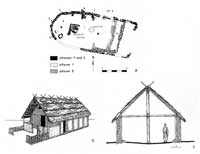 Al centro delle abitazioni troviamo una fila di pali che sostengono il tetto. Ci sono anche edifici più grandi, con peristasi lignee, come ad esempio il tempio di Artemide ad Año Mazaraki, datato dal deposito votivo al 700 a.C.(fig. 6). Le abitazioni a pianta rettangolare di Zagora di Andros in una prima fase sono costituite da un unico ambiente. In seguito le case si ingrandiscono e sono composte da due o più vani che si aprono su un cortile (fig. 7). L’ambiente principale è contraddistinto da un bancone lungo le pareti su cui vengono appoggiati dei grandi vasi che sono contenitori di derrate. Al centro c’è un focolare; il tetto è a terrazza, sorretto da pali lignei. Dai santuari di Hera in Grecia provengono numerosi modelli votivi che ci mostrano le diverse tipologie di questi edifici di età geometrica e altoarcaica, con tetti spioventi molto inclinati, coperti da un mantello di paglia, oppure a terrazza (figg. 8, 9).