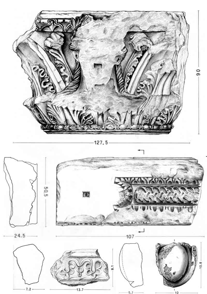 Figura 9 — Decorazione architettonica. Disegni originali in scala 1:1/1:5. Riproduzioni ridotte (rilievi di Tommaso.Semeraro, da R. Cassano (a cura di),