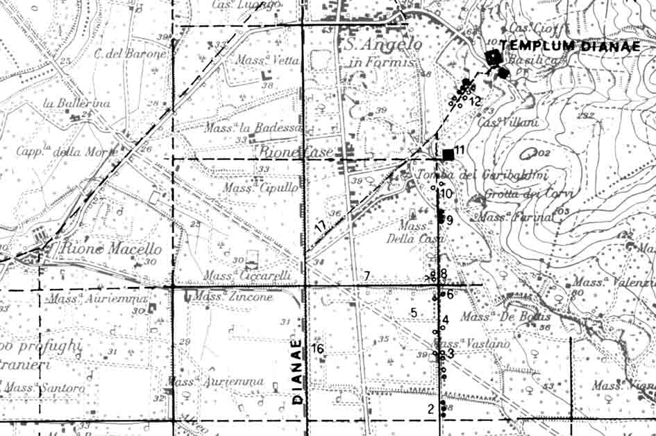 Figura 19 — Tracce della centuriazione romana.dell’ager Campanus e altre evidenze archeologiche riportate sulla tavoletta IGM del territorio a nord di Santa Maria Capua Vetere (da Stefania Gigli, La via Dianae: appunti di topografia, in ATTA 8, 1999, pp. 29-50)