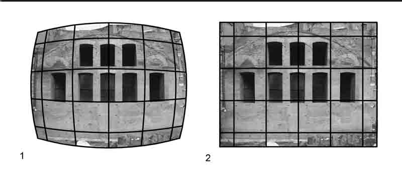 figura 48b - 1. Distorsione radiale “a barilotto”. 2. Fotogramma raddrizzato