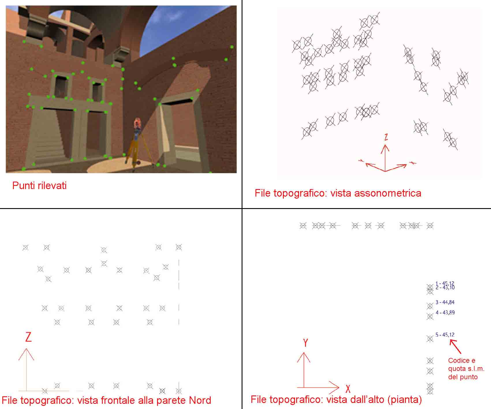 figura 40 - Visualizzazione dei punti del rilievo in CAD secondo varie direzioni