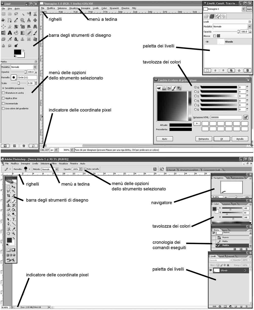 figura 60 — Interfaccia di Gimp (sopra) e di Photoshop (sotto)