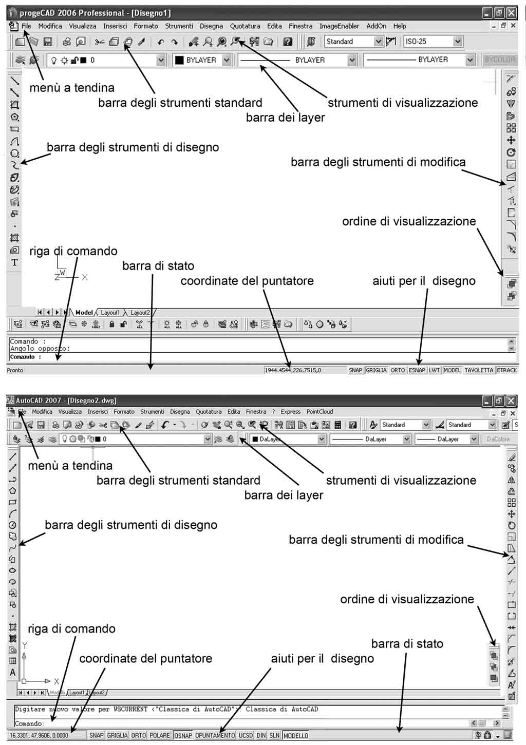 figura 69 - L’interfaccia di ProgeCAD, versione italiana di IntelliCAD, (sopra) e quella di AutoCAD (sotto)