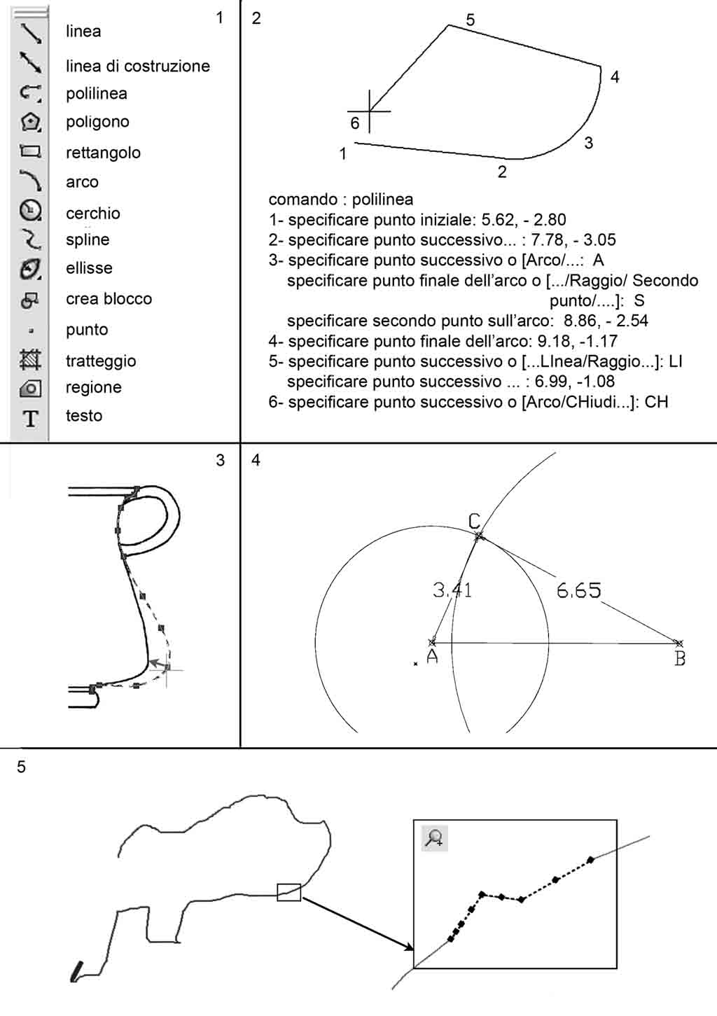 figura 72 - 1. Barra degli strumenti di disegno (ProgeCAD). 2. Costruzione di una polilinea. 3. Spline modificata trascinando i grip. 4. Uso dei cerchi per le trilaterazioni. 5. La sketch (a destra un particolare della linea)