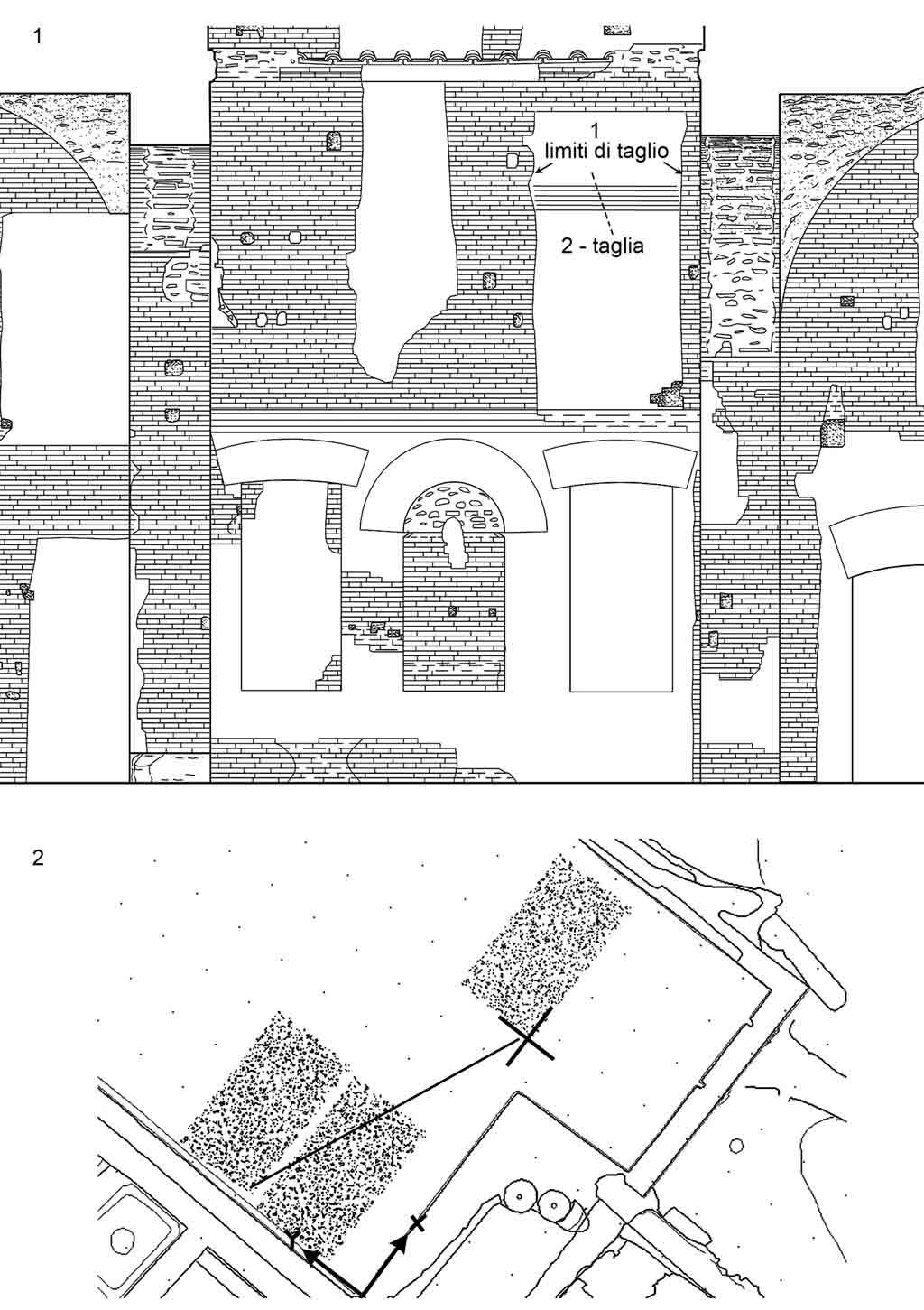 figura 77b — Caratterizzazione archeologica in CAD. 1. Parete in opera laterizia. 2. Pavimentazione in cocciopesto