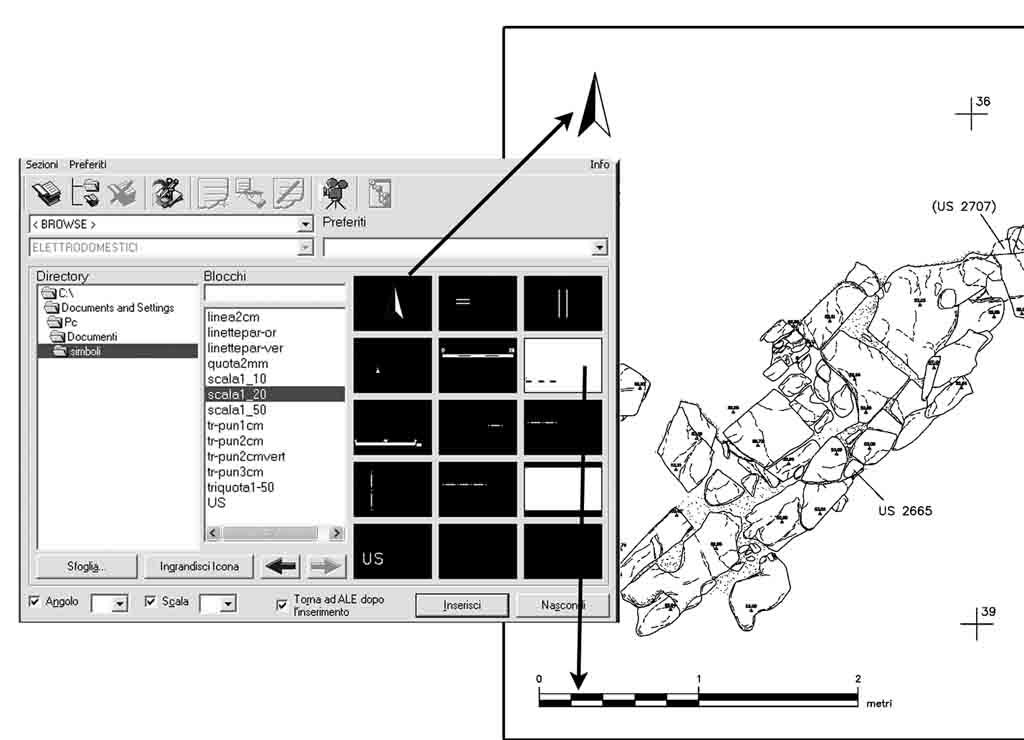 figura 81 —Elementi grafici trascinati sull’area di disegno da una finestra che consente la navigazione e la visualizzazione delle librerie grafiche e degli altri file DWG archiviati (ProgeCAD)