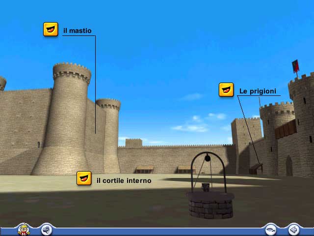 figura 105c - L’immagine, tratta da una enciclopedia elettronica per ragazzi della De Agostini, mostra il cortile di un castello ricostruito in 3d, punto di arrivo di una prima animazione che ha fatto ingresso nell’edificio partendo dall’area esterna e attraversando il portale delle mura. Giunti nel cortile vengono mostrati sullo schermo dei pulsanti che consentono di scegliere fra tre differenti tragitti cui corrispondono altrettante animazioni. Seguendo questi itinerari si potranno visualizzare in alcuni punti significativi dell'edificio altri pulsanti, i quali consentiranno di aprire dei testi scritti di approfondimento. Al termine di ogni animazione sarà possibile ritornare nel cortile e accedere a un altro percorso.
