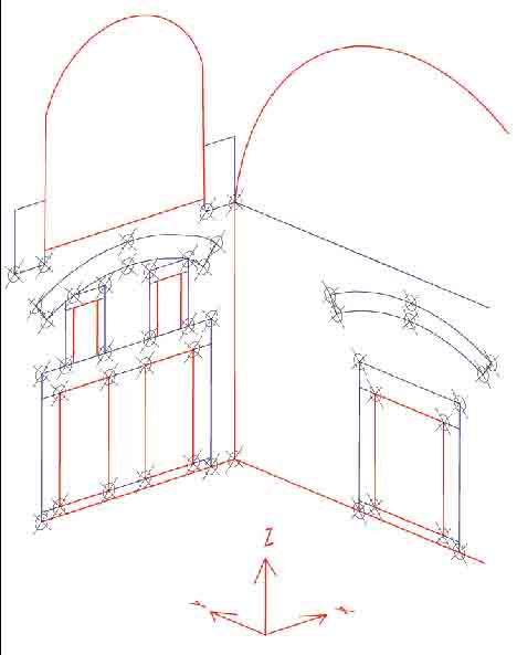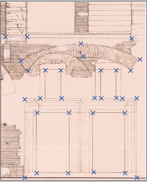 In cantiere si sovrappone alla tavola dei punti un foglio di poliestere pulito e su questo, appoggiandosi alle croci numerate dei punti del rilievo topografico, si disegnano i contorni dei vari elementi architettonici (figg. 41b, 41c). Si utilizzano i tradizionali strumenti del rilievo diretto - metri, filo a piombo, livella, ecc. — prendendo le misure a partire dai punti di dettaglio che sono stati materializzati con chiodi, etichette adesive o altro e in parte si lavora “a occhio”.
