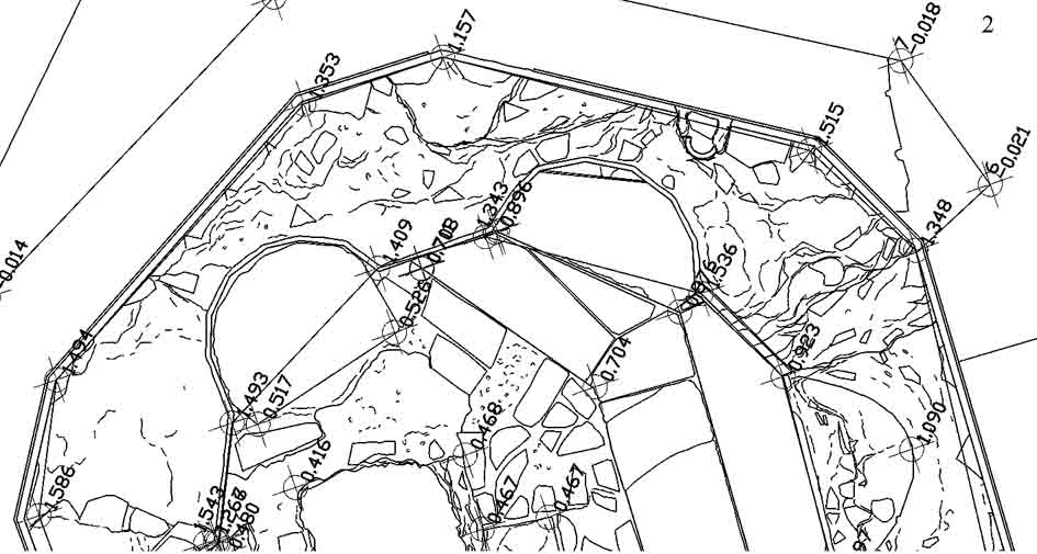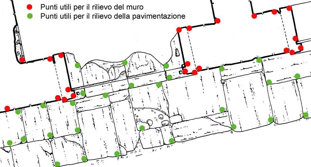 Naturalmente se le superfici da riprodurre presentano numerosi dettagli, in fase di rilievo indiretto bisogna prevedere di battere un sufficiente numero di punti, utili a sveltire la successiva fase del rilievo diretto. In merito alla loro quantità serve trovare un giusto equilibrio. I punti di dettaglio andrebbero sempre materializzati e collocati in maniera strategica, privilegiando gli allineamenti — filari dei paramenti murari, lastre della pavimentazione, ecc (fig. 41d). Alcuni rilevatori battono con la stazione totale un’infinità di punti, tutt’intorno i contorni delle varie US, evitando quasi completamente il rilievo diretto. La velocità della stazione totale tende a incoraggiare questo metodo. Tuttavia in ambito archeologico il rilievo diretto è un passaggio che favorisce una lettura più attenta ed approfondita dei manufatti dando modo di cogliere numerosi particolari che rischierebbero di sfuggire con operazioni troppo automatizzate, per cui non ritengo opportuno cercare di saltare del tutto questa procedura. Inoltre è buona regola controllare sempre con il rilievo diretto le effettive dimensioni dei vari elementi architettonici (spessore dei muri, lunghezza e larghezza delle lastre pavimentali, ecc.), perché con il rilievo strumentale può accadere di non accorgersi che il punto misurato si trova su una parte usurata o fuori piombo della struttura e non coincide quindi con il profilo originario.