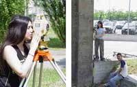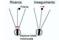 La versione più evoluta di questo tipo di strumento è la stazione totale motorizzata, dotata di servomeccanismi che gli consentono di collimare automaticamente un prisma in movimento, quando questo sia posto presso il reticolo del canocchiale (fig. 36d). Il rilievo può essere svolto pertanto da un solo operatore il quale si sposta sul terreno impugnando la palina portaprisma, posizionandosi sui vari punti da misurare, inseguito dal canocchiale dello strumento (fig. 36e). Qualora l’operatore, a causa di uno spostamento veloce e improvviso, venga a trovarsi al di fuori del campo visivo, egli può attivare la procedura di ricerca per mezzo di un dispositivo posto sulla palina che invia un segnale a infrarossi in direzione della stazione totale, la quale di conseguenza si riallinea verso il prisma.