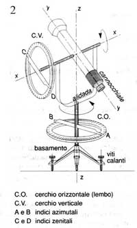 Nel teodolite ottico-meccanico i valori degli angoli sono riportati su due cerchi graduati — il cerchio orizzontale e il cerchio verticale — situati rispettivamente nel basamento e in uno dei montanti dell’alidada (fig.35). La lettura dei due goniometri si effettua guardando dentro un mirino (microscopio di lettura) situato accanto l’oculare del cannocchiale e i dati vengono trascritti su un libretto. Le stazioni totali sono invece dotate di cerchi non numerati, con tacche alternativamente opache e trasparenti, che inviano segnali luminosi binari a un contatore elettronico; i valori angolari sono memorizzati dal computer e visualizzati sul display.