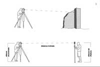 La misura della distanza inclinata viene eseguita per mezzo del distanziometro elettronico incorporato nella stazione totale. Un raggio laser rosso fuoriesce dall’obiettivo del cannocchiale, colpisce il punto mirato e torna indietro. Lo strumento registra il tempo impiegato dall’impulso luminoso calcolando di conseguenza la distanza percorsa. I primi distanziometri funzionavano esclusivamente colpendo con il laser uno speciale specchio riflettente (prisma) che si monta su un treppiede o una palina. Il laser degli apparecchi più recenti può riflettersi invece anche su superfici opache come le murature (fig. 36a). Ciò ha contribuito a sveltire enormemente la procedura del rilievo, consentendo di misurare le distanze anche di punti situati in luoghi inaccessibili.
