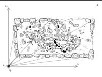 L’ipotesi di lavoro più elementare è quella del rilievo indiretto di una serie di punti i quali sono visibili da un’unica stazione, come nel caso di un piccolo saggio di scavo o di un’area archeologica con resti murari conservati per un’altezza limitata e quindi priva di ostacoli visivi. Si può posizionare lo strumento topografico in un qualunque punto dotato delle necessarie condizioni di visibilità e impostare un sistema di coordinate locale con l’origine sulla stazione stessa (fig. 37d). In tal caso esso coinciderà con il sistema di coordinate polari in cui opera la stazione totale. Una volta inseriti tutti i dati relativi alla stazione (coordinate, altezza strumentale, ecc.), viene effettuato l’orientamento impostando l’asse polare (asse delle y) grosso modo in senso normale o parallelo a uno dei lati principali dell’area. Si procede quindi al rilievo dei singoli punti con il metodo dell’irraggiamento, che consiste nel mirare a tutti i punti utili che sono visibili dalla stazione.