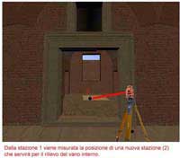 La rete dei vertici della poligonale può essere infittita da capisaldi secondari utili per il rilievo di singoli ambienti. Una volta fissata la rete dei capisaldi si posiziona lo strumento sulle singole stazioni per effettuare il rilievo dei punti di dettaglio con il sistema dell’irraggiamento.