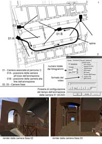Una prima soluzione consiste nel girare più filmati, lungo percorsi diversi, i quali potranno essere successivamente combinati all’interno di un programma di authoring multimediale (fig. 105c). Questo genere di software servono a confezionare prodotti divulgativi, destinati a CD, DVD o a siti WEB, mettendo insieme file di diverso tipo — video, audio, testo, fotografie - rendendoli fruibili in modo interattivo per mezzo di un‘interfaccia amichevole, dotata di pulsanti che consentono di accedere ai vari contenuti in maniera semplice e intuitiva. L’esplorazione di modelli tridimensionali avviene a partire da una homepage che inquadra in genere l’oggetto dall’esterno e permette di scegliere tra diversi percorsi elencati su una serie di pulsanti. Una volta selezionato uno di questi si avvierà un’animazione che si snoderà lungo un determinato tragitto e sarà intervallata da una serie di punti di sosta ove sarà possibile accedere a vari contenuti informativi (immagini fotografiche, tabelle) oppure imboccare un nuovo percorso animato che condurrà in un’altra direzione.