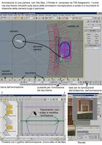 Allo stesso modo si potrà intervenire sui movimenti della camera (video) immettendo un key-frame lungo il percorso a cui faremo seguire una rotazione dell’oggetto in una data direzione fino a un altro key-frame, dopo il quale programmeremo una rotazione in una diversa direzione oppure una sosta o un rallentamento, utilizzando in questi ultimi casi il comando Sposta e trascinando la camera in un certo modo lungo la spline del percorso fino a immettere l’ennesima chiave (fig. 105a n. 1). I programmi danno la possibilità di visualizzare rapidamente delle anteprime dei movimenti programmati sulla scena in modo da apportare nel caso le necessarie correzioni.