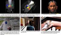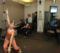 Per le animazioni più complesse dei personaggi virtuali si usano dei mimi, uomini reali che compiono una serie di movimenti in laboratorio, indossando sensori ottici o dei segnali ben visibili in corrispondenza delle articolazioni, i quali vengono ripresi da camere digitali. Con la tecnica del rotoscoping si produce un filmato che viene importato nel programma di modellazione 3d; l’umanoide tridimensionale viene sovrapposto all’immagine in scorrimento del mimo e gli si fanno assumere le stesse posizioni; si immetterà un keyframe all’inizio e alla fine di ciascun movimento delle varie parti del corpo. Una tecnica più precisa, ma più complessa e costosa, è la motion capture. In questo caso una serie di telecamere rileva istante per istante la posizione spaziale dei sensori ottici portati dal mimo sulle articolazioni, generando un file che verrà elaborato nel software di animazione (fig. 105b ).