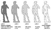 Tra le tecniche che consentono una accelerazione dei tempi di calcolo delle immagini in movimento va menzionato il LOD (level of Detail o livello di dettaglio dinamico) che ha trovato larga applicazione nel campo dei videogiochi ed è stato quindi sviluppato da diversi software di grafica (fig. 106) Esso consiste nel rappresentare gli oggetti 3d attraverso diversi gradi di approssimazione, a seconda della distanza in cui si trova l’osservatore. Un algoritmo sintetizza la forma degli oggetti lontani, diminuendo il numero dei poligoni che compongono la mesh. Man mano che l’osservatore si avvicina le sfaccettature aumentano gradualmente di densità.