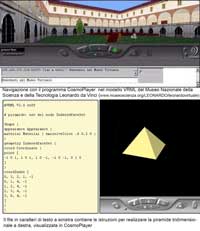 La navigazione in tempo reale ha trovato ostacoli ancora maggiori in internet a causa della velocità relativamente limitata della trasmissione dei dati. I modelli 3d destinati al web sono stati fino a oggi costruiti per mezzo di un particolare linguaggio di programmazione denominato VRML (Virtual Reality Markup Language) (fig. 107a). Sono semplici file di testo - con estensione VRL — che utilizzano caratteri ASCII, come i file HTML, e che contengono tutti i comandi necessari per realizzare una scena tridimensionale, dalla modellazione al posizionamento delle luci fino all’applicazione di texture di materiali. Animazioni, luci, suoni ed altri aspetti del mondo virtuale interagiscono con l'utente oppure vengono attivati da eventi esterni come i timer.