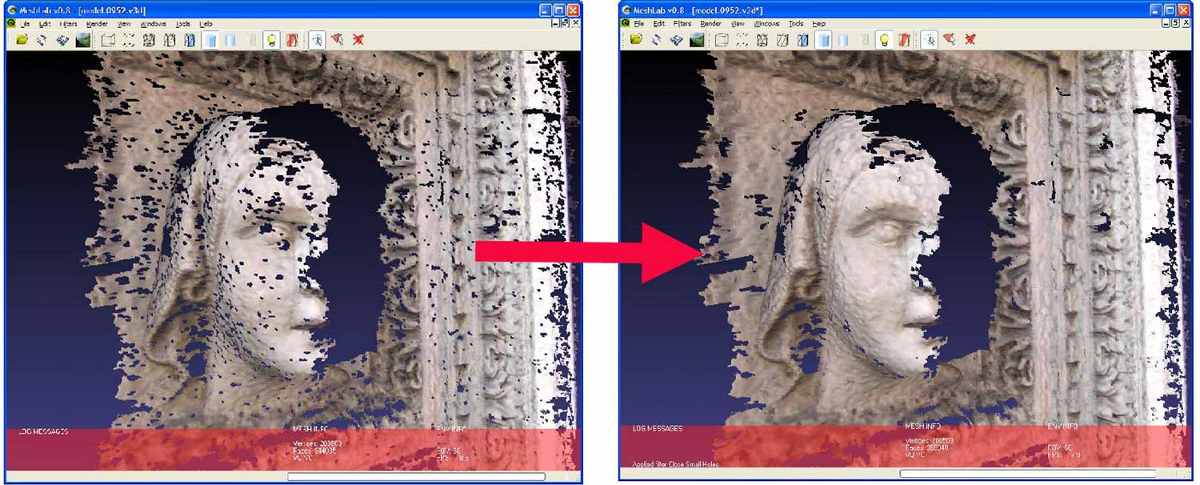 figura 97b - Operazione di editing delle mesh per mezzo del programma MeshLab, un open source sviluppato dal Visual Computing Lab dell'ISTI - CNR: riempimento automatico di tutti i buchi aventi dimensioni inferiori a una determinata soglia stabilita dall'utente.