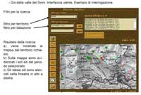 Le ricerche condotte nel GIS, rispetto a quelle dei database alfanumerici, hanno il vantaggio di visualizzare anche dati spaziali. Nella fig. 122a si può ad esempio vedere una query formulata nel GIS della valle del Sinni, per mezzo di due caselle combinate che utilizzate insieme funzionano da operatore Booleano “and”. Si cercano tutte le presenze archeologiche del territorio di Senise “and” del Primo impero. Si intende che sono esclusi tutti gli altri periodi. Viene pertanto visualizzata nella finestra più grande la cartografia del territorio di Senise e i soli simboli dei siti del periodo richiesto. In alto a destra compare la tabella dei siti selezionati, con i relativi ID e altre informazioni essenziali. I simboli grafici della pianta sono poi collegati a maschere contenenti informazioni più approfondite che si mostreranno attivando il comando Identifica e cliccando sui simboli.