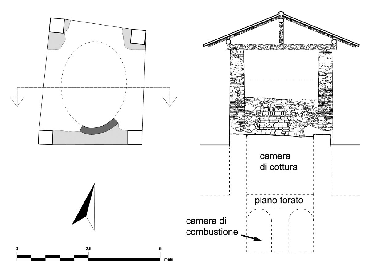 Figura 2 - Fornace di Sabatino Grossi. Pianta e sezione dei resti visibili. La ricostruzione a tratteggio delle parti interrate dell’edificio è stata realizzata tenendo conto delle descrizioni dei fornaciai (rilievo di M. Bianchini e S. Mari)
