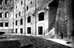 Figura 5 - Il Corpo Centrale visto dall'arcone cavalcavia. Del corpo di fabbrica visibile al centro si è preservata la parte inferiore, compreso il nucleo cementizio delle arcatelle pensili. E' andata distrutta la facciata traianea dei piani superiori. Si conserva però buona parte dei muri interni del "piano nobile" sopra le arcatelle. Le stanze, coperte da volte a botte, avevano un'altezza considerevole, pari a quella degli ambienti dell'attiguo settore settentrionale del Corpo Centrale del quale si è conservata anche la facciata (se ne intravede un pezzo a sinistra nell'immagine). Questi ultimi presentano, sopra la finestra principale, una finestrella quadrata iscritta nella lunetta della volta. Questa soluzione è stata pertanto riproposta nella ricostruzione della fronte a sud. L'esame della muratura che si è conservata intorno l'angolo tra le due facciate ci fa escludere invece che le cornici a mattoni che scandiscono la fronte a nord, proseguissero lungo quella meridionale.