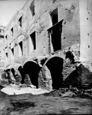 Figura 2 - L'angolo SO dell'edificio della Grande Aula. La facciata occidentale (a sinistra) è stata integrata con la fila di arcatelle pensili, delle quali nel 1930 fu ripristinato solo un breve tratto. In quell'epoca la parte superiore della facciata fu molto restaurata. Alcune breccie che erano state praticate nella muratura durante il riuso moderno, si presentavano talmente ampie che all'interno di una queste venne ipotizzata l'esistenza di una porta sormontata da finestrella che metteva in comunicazione la Grande Aula con il camminamento esterno (foto a destra). Evidentemente nel corso dei lavori c'è stato un ripensamento per cui si è preferita una ricostruzione caratterizzata da una maggiore omogeneità architettonica.