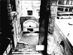 Figura 15 - La fronte del corpo-scala NO della Grande Aula che è andato distrutto insieme ai muri esterni. Le rampe interne sono state ricostruite sulla base delle impronte rimaste sulla parete S (a sinistra). Restano anche alcune tracce del doppio portale che si apriva al pian terreno della Grande Aula, il quale si confronta con quello del corpo-scala situato all'angolo opposto dell'edificio. Sull'argomento cfr. M. Bianchini, M. Vitti, La fronte della Grande Aula e il suo sistema scalare, in AA.VV., I Mercati di Traiano alla luce dei recenti restauri e delle indagini archeologiche, Giornata di studio presso l’Istituto Archeologico Germanico di Roma, (15 maggio 2003), in BCom, CIV, 2003 (2005), pp. 285-306.